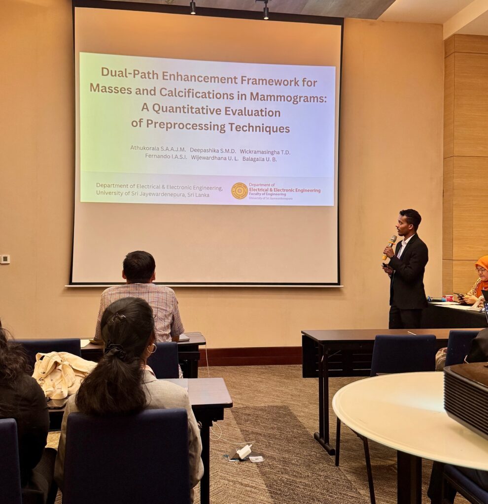 The paper titled “Dual-Path Enhancement Framework for Masses and Calcifications in Mammograms: A Quantitative Evaluation of Preprocessing Techniques” was presented by Mr. Janindu Athukorala, and the paper titled “Enhancing Thermal Imaging Accuracy for Power System Maintenance” was presented by Mr. Gethwan Suriyawansa and Mr. Rusira Thilakarathna.